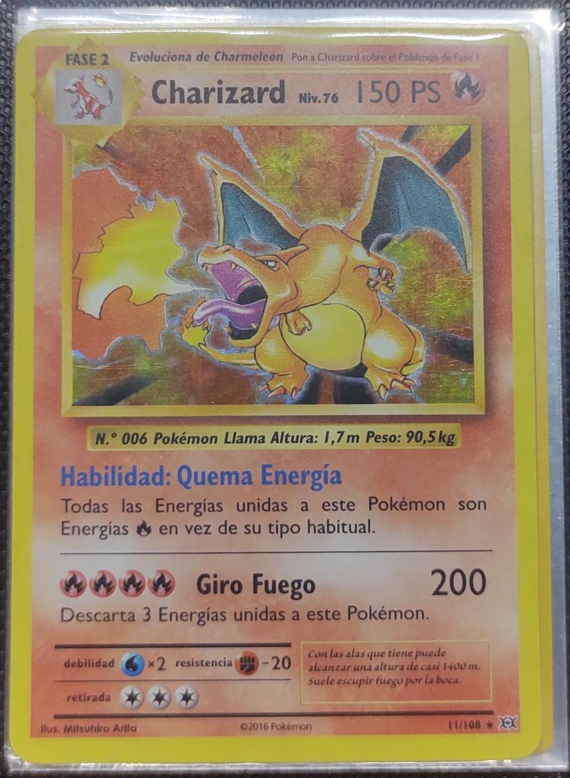 El Charizard 11/108 Holo Rare de la expansión XY Evolutions es una de las cartas más emblemáticas del TCG Pokémon, un homenaje directo al clásico diseño de Base Set (1999) que marcó a toda una generación.