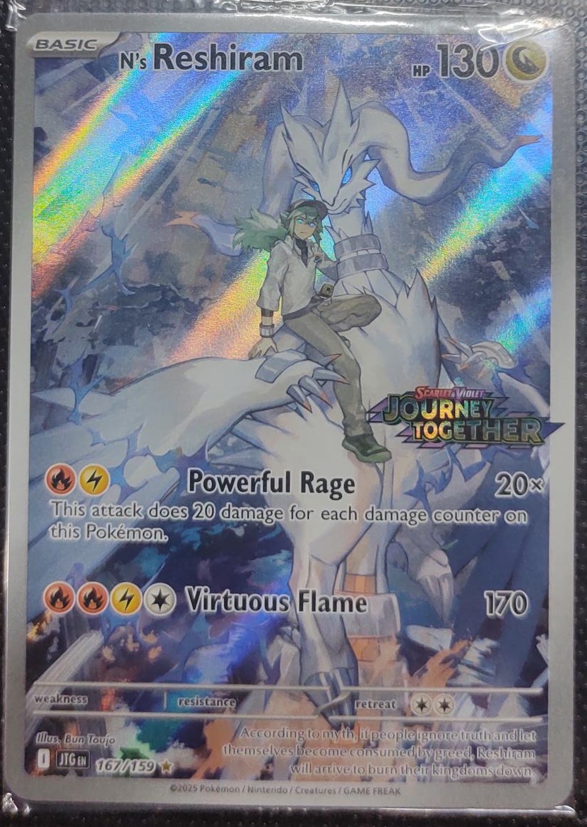 La carta N’s Reshiram – 167/159 (Secret Rare Stamped) de la expansión Journey Together es una de las piezas más destacadas de esta colección especial. Con un arte impresionante que muestra a N junto a Reshiram, transmite la poderosa conexión entre el mítico dragón de fuego y su entrenador.
